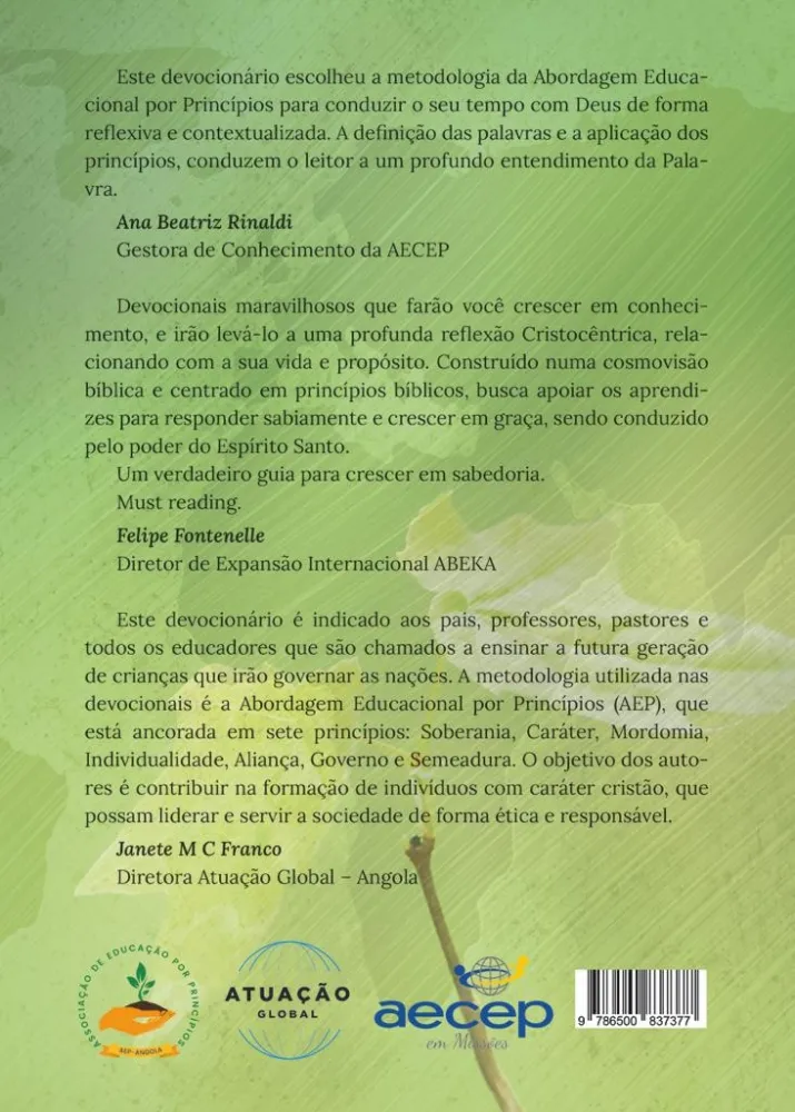 Esse livro devocionário tem o propósito de espalhar a Educação por princípios na África, começando por Angola. Criamos uma série de três livros de devocionais para a família, escola e a igreja junto com um grupo de líderes e educadores Angolanos que compartilham da mesma visão: “paixão por uma educação transformadora”, utilizando princípios. Esse LIVRO ensina como fazer uma Devocional através do PRRR (metodologia da Abordagem educacional por princípios). Ensina a meditar e ter uma conscientização do princípio para ser aplicado.